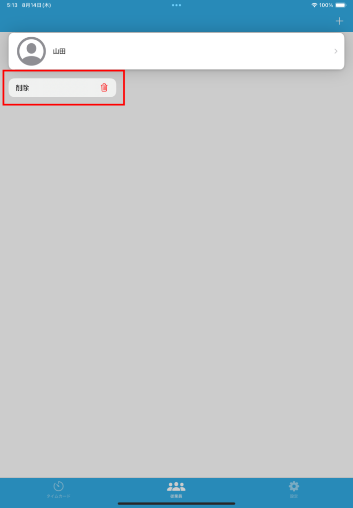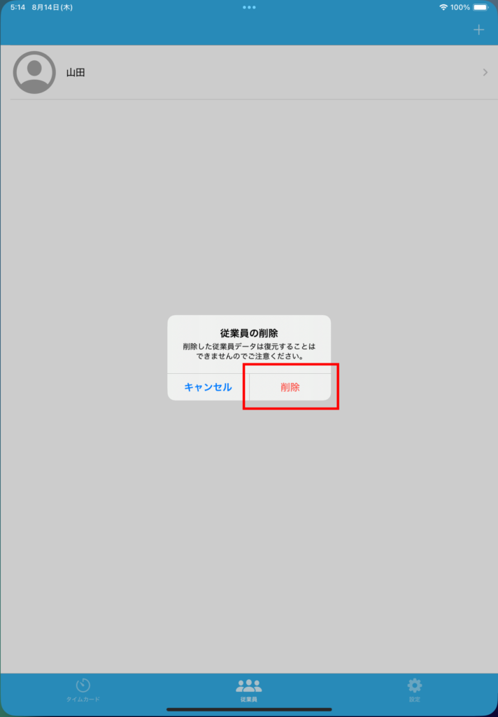 従業員 – 削除 2025年8月12日2025年8月14日 投稿者: admin従業員の削除を行います。従業員をロングタップするとメニューが表示されます。「削除」をタップすると削除の確認画面が表示されますので「削除」をタップしてください。従業員の削除を行うと、従業員データ・勤務データの全てが削除され、復元は行えません。従業員の勤務データの保存が必要な場合は勤務状況のCSV出力をお勧めします。
