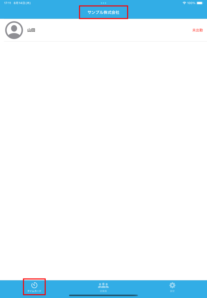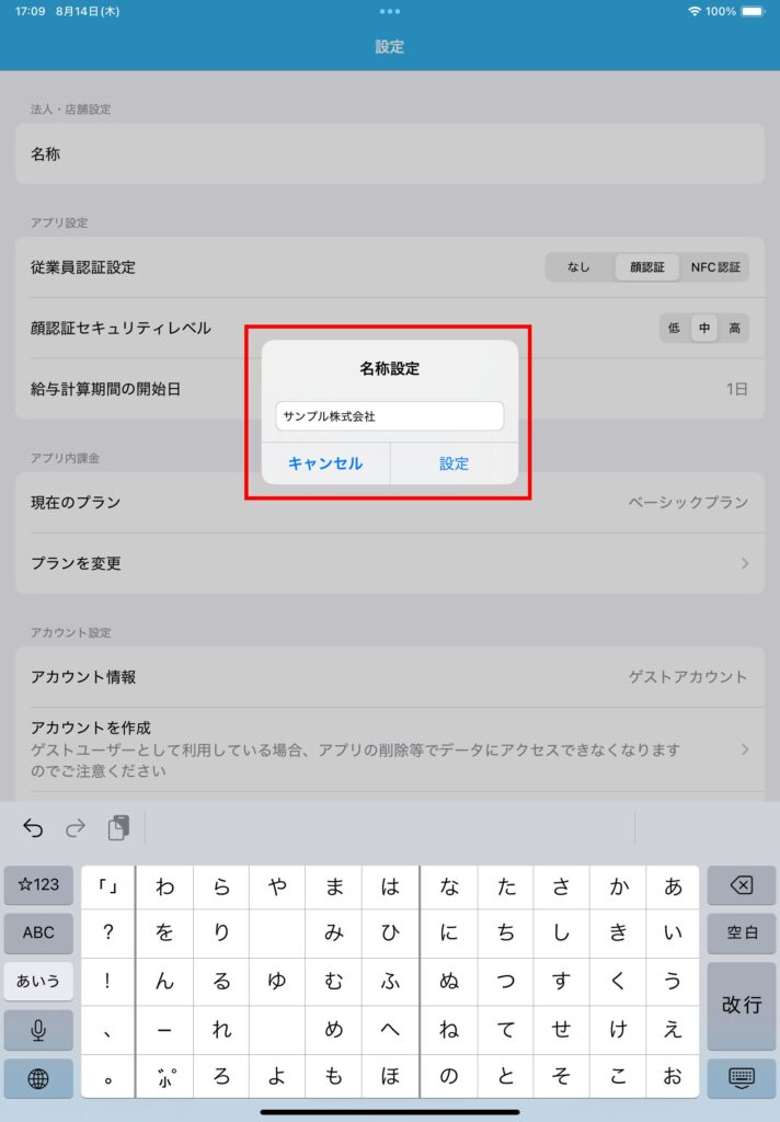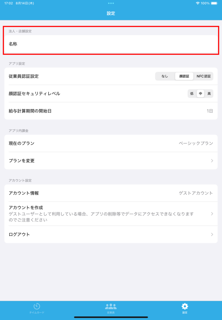 設定 – 名称 2025年8月12日2025年8月14日 投稿者: admin法人名・店舗名称を設定してください。タップすると名称入力画面が表示されます。設定された名称は一部の画面に表示されますが、設定は任意です。表示箇所タイムカードタブの最上部