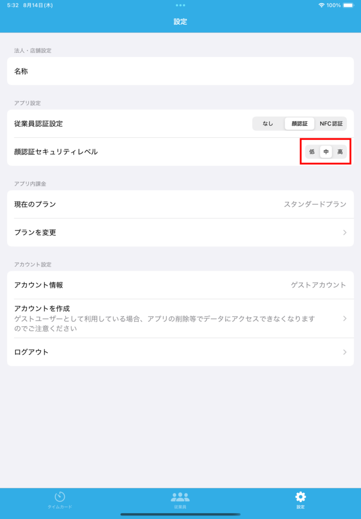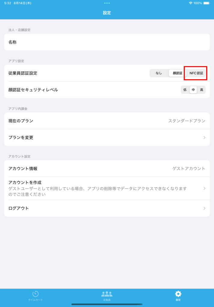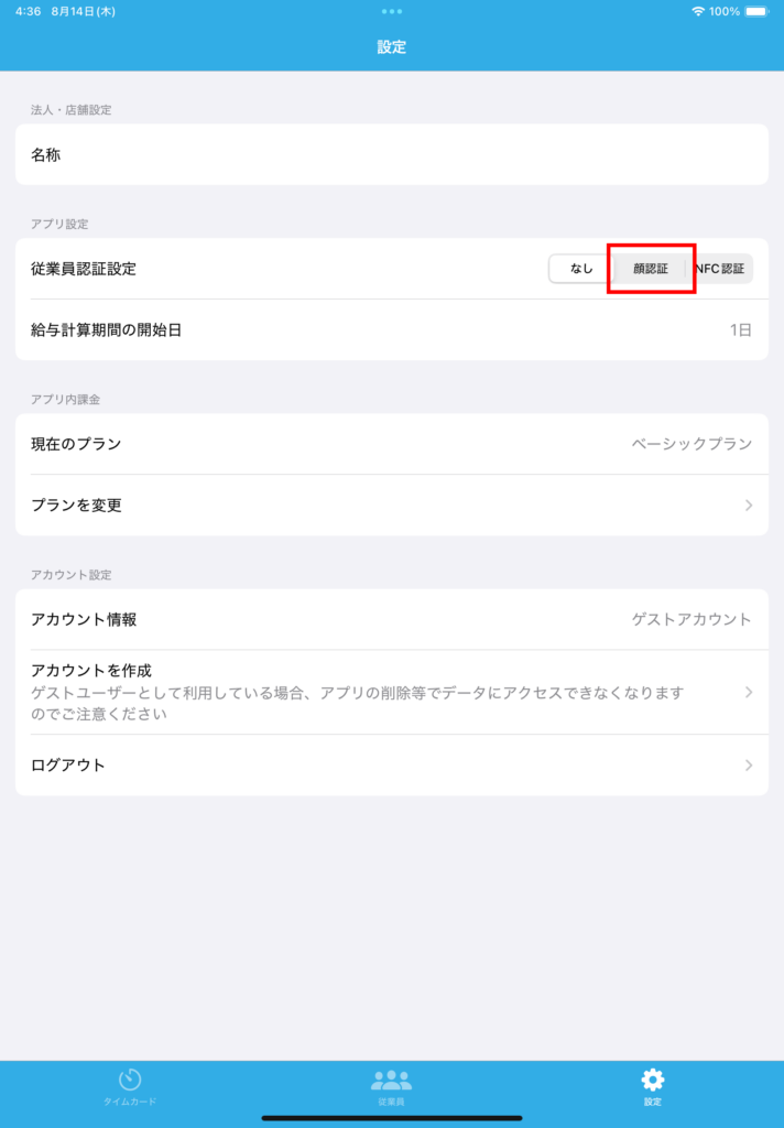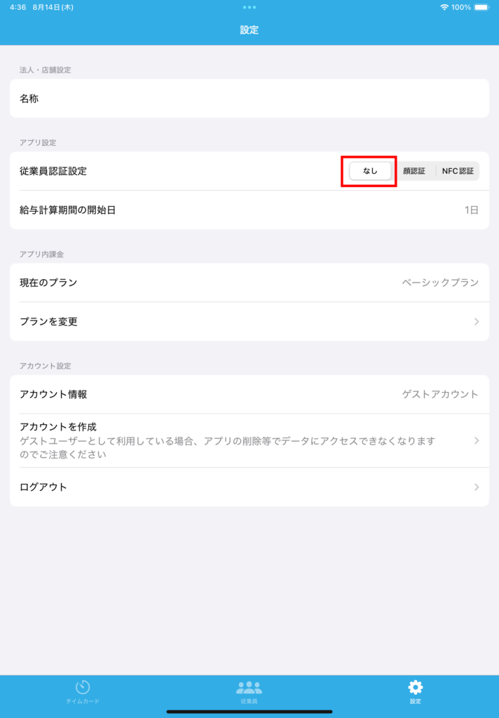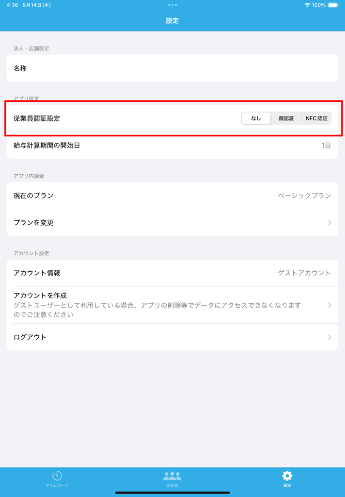 アプリ内の「設定」の「従業員認証設定」を設定可能です。